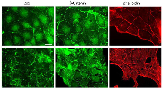 Loss of Vhl is associated with an epithelial to mesenchymal transition (EMT) like phenotype [21]. We have, therefore, analyzed if this is also the case in the cell model that we used. We have performed immunofluorescence analysis using specific antibodies for markers of tight (Zona occludens 1, Zo1) and adherence junctions (β-catenin). While the control cells showed localization of ß-catenin at the cell–cell contacts, this was not the case in Vhl-KO cells (Figure 2).