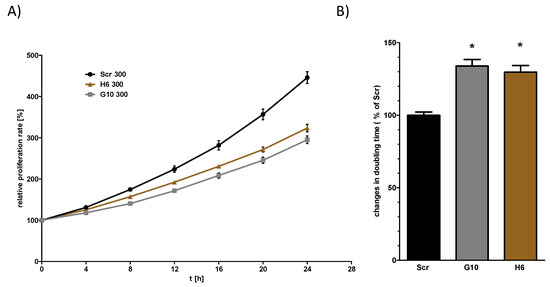 von Hippel–Lindau (Vhl) deletion is associated with longer doubling time. Cells were cultivated in 96-well plates and the proliferation was measured by live-cell imaging using IncuCyte S3 system taking an image every 4 h. The relative cell density was plotted and the doubling time was calculated by nonlinear exponential growth equation using GraphPad Prism (A). The doubling times were normalized to the Scr cells (B). One Way ANOVA was performed to identify statistically significant differences compared to Scr cell and are marked by * (p value < 0.05; n > 5).