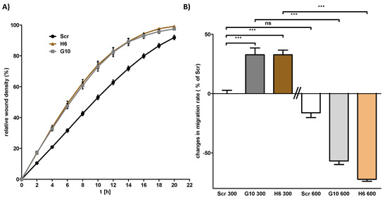 Loss of von Hippel–Lindau (Vhl) expression induces cell migration capacity. Cells were cultivated in 96-well plates until confluency and a wound to the cell monolayer was applied using the AutoScratch wound making tool. Cell migration was observed by live-cell imaging using the IncuCyte S3 system. (A) Representative plot of the wound density over time. (B) Cells were cultivated in 96-well plates until confluency either at 300 or 600 mosmol/kg. The relative wound density after 12 h was calculated by linear regression analysis using GraphPad Prism. The migration speed was normalized to Scr cells cultivated at 300 mosmol/kg. One Way ANOVA was performed to identify statistically significant differences and are marked by *** (p value < 0.001; n > 3).