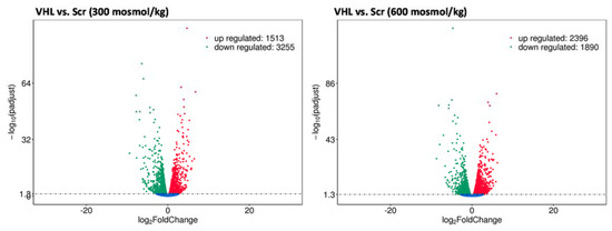 VHL (von Hippel–Lindau) deletion induces massive changes in gene expression. Scr- and Vhl-KO cells were cultivated at 300 or 600 mosmol/kg. Total RNA was isolated and gene expression was analyzed using Next-Generation Sequencing technology and differentially expressed genes were identified (p < 0.05, n = 3). The volcano plots show the number of genes, the p-values, and log2 fold changes for cells cultivated at 300 (left) or 600 (right) mosmol/kg.