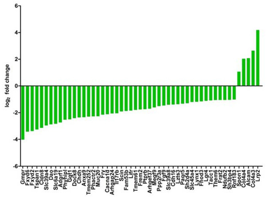 We have shown that the expression of hyperosmolality induced genes is reduced in RCC samples and that a gene signature of osmolality affected genes can be used for the prediction of patient’s clinical outcome [16]. We have, therefore, analyzed if this is also the case in the present study. We have generated a list of genes that are upregulated by hyperosmolality and have a favorable prognostic outcome for patients with RCC. This list was compared with the list of genes that were differentially expressed (and a log2 fold change of at least 1/−1) in Vhl-KO cells under hyperosmotic conditions. We identified 51 genes that met the criteria (Figure 7). Only 5 genes were higher expressed compared to Scr in Vhl-KO cells under hyperosmotic conditions. The majority, 46 genes, were downregulated in expression. This again demonstrates that loss of Vhl induces an unfavorable gene expression pattern. These data also show that Vhl has an influence on the expression of hyperosmolality affected genes.
