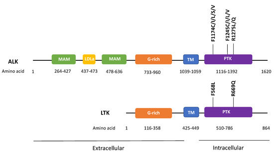 - Roll, J.D.; Reuther, G.W. ALK-activating homologous mutations in LTK induce cellular transformation. PLoS ONE 2012, 7, e31733. [Google Scholar] [CrossRef] [PubMed]