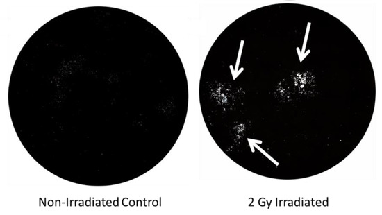 2 Gy increases osteoclast activity, resulting in a 390% increase (p < 0.05) in resorbed surface area of hydroxyapatite (white spots indicated by arrows). n = 3 replicates.