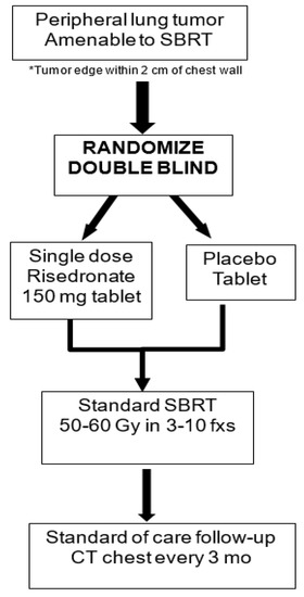 Study Schema. SBRT, stereotactic body radiotherapy. Placebo = methylcellulose; Study drug to be given approximately 10 days prior to SBRT start.