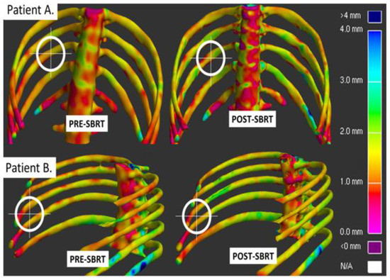 Additionally, our group performed an initial retrospective analysis of a very small number of patients, n = 2, with peripheral lung tumors who were incidentally taking bisphosphonates when they were treated with lung SBRT. We found no increased risk of any toxicity from concurrent SBRT and bisphosphonate therapy. Furthermore, on cortical thickness mapping, these patients had minimal cortical thinning of the ribs near the irradiated site (Figure 4).