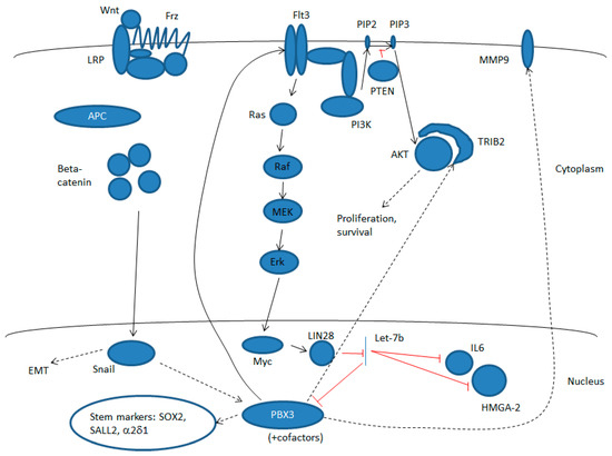 Pre-B cell leukemia (PBX3) is a target and a regulator of multiple signaling pathways. These include the MEK/ERK pathway, and notably tyrosine kinase receptor Flt3. Activation of this pathway represents a positive feedback loop in which increased expression of the Myc transcription factor activates LIN28 expression, which in turn inhibits biogenesis of miR-let-7b, an miR that blocks PBX3 expression post-transcriptionally. PBX3 also increases signaling through the AKT pathway by activating expression of the AKT activator protein, TRIP2. In addition, PBX3 expression increases in response to the signaling through the canonical WNT pathway via the activation of the Snail transcription factor. Activation of PBX3 through these pathways increases epithelial-to-mesenchymal transition (EMT) and hence invasion and metastasis (in part through increasing MMP9, IL6, and HMGA-2 expression) as well as cell survival and proliferation, and can also confer a TIC phenotype through upregulation of the SOX2 and SALL2 transcription factors and voltage-gated calcium channel α2δ1. Dashed lines represent indirect pathways involving multiple steps and additional components.