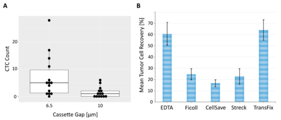 While the workflow resulting from this study stems from extensive experiments, some limitations require mentioning. The main limitation is that switching to the 6.5 μm gap sized cassette increased processing time and white blood cell background (Table S2, Figure S1). Sample processing time can be managed by using a high separation pressure of 99 mbar. Average processing times of 2 h for a complete EDTA (50 mbar) and 1.5 h for a TransFix sample (99 mbar) were deemed acceptable for sufficient sample turnover. White blood cell background has been shown to lie at 200–800 nucleated cells per mL of processed blood when using the 6.5 μm gap sized cassette [33]. This is known to be donor dependent [20], yet translates to an at least 105 fold depletion of white blood cells [33]. In combination with our approach to CTC visualization, comprised of cytospin and subsequent ICC staining, this background leukocyte level is of no hindrance. Single CTCs detected on the cytospin can easily be picked via micromanipulation for subsequent molecular characterization. Additionally, this approach allows for sample storage and does not necessitate direct staining and evaluation (such as in cassette enumeration would), thereby circumventing long processing times and increasing comparability between samples. Another point of criticism might be the limited patient collective processed in this study as well as the mixed tumor entities of our cohort. This point is somewhat compensated by the fact that the entities tested (mNSCLC and mGIC) are known to be difficult for CTC enrichment [13,34,35]. A positivity rate of 46.2% in these patients therefore speaks to the value of our established workflow. Additionally, establishing protocols that demonstrate superiority across multiple tumor entities increase credibility and translational value of the tested method.