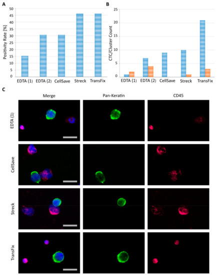 In conclusion, TransFix® preservation tubes proved optimal in combination with Parsortix® separation and subsequent ICC staining on cytospins, resulting in high overall positivity rates of 46.2% (Figure 3A) and highest total CTC counts detected (Figure 3B). Furthermore, these tubes guarantee intact tumor cell morphology (Figure 3C) and enable detection of CTC clusters (Table S5).