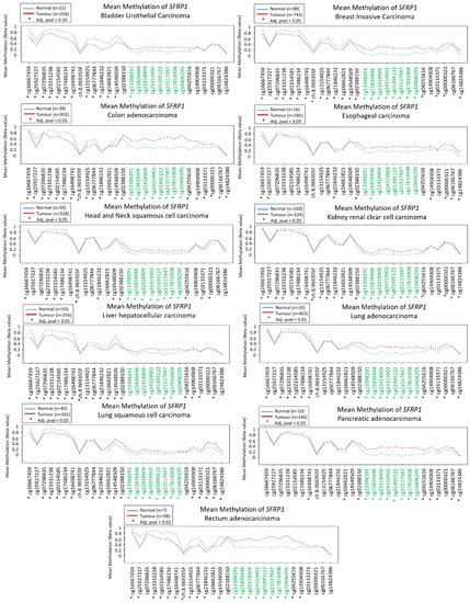 In gastric cancer, SFRP1 methylation was associated with loss of SFRP1 expression and occurred in the early event of this cancer. The epigenetic silencing of SFRP1 was also significantly correlated with tumor stage and lymph node status [43]. To illustrate the methylation signatures of SFRP1 among various cancers, the signatures from the TCGA datasets are displayed in Figure 1. Table 2 summarizes other published literature within six years pertaining to epigenetic regulation of SFRP1 in human cancers.