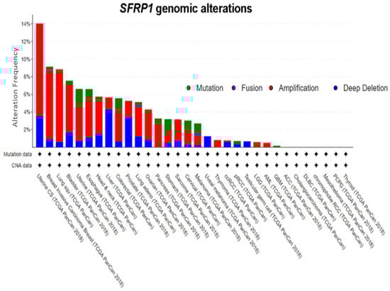 Genomic alterations in SFRP1. Amplification is the most frequent genomic event in SFRP1. Abbreviations: ACC, adrenocortical carcinoma; BLCA, bladder urothelial carcinoma; BRCA, breast invasive carcinoma; CESC, cervical squamous cell carcinoma and endocervical adenocarcinoma; CHOL, cholangiocarcinoma; COAD, colon adenocarcinoma; COADREAD, colorectal adenocarcinoma; DLBC, lymphoid neoplasm diffuse large B-cell lymphoma; ESCA, esophageal carcinoma; GBM, glioblastoma multiforme; GBMLGG, glioblastoma multiforme Brain lower grade glioma; HNSC, head and neck squamous cell carcinoma; KICH, kidney chromophobe; KIPAN, pan-kidney cohort (KICH+KIRC+KIRP); KIRC, kidney renal clear cell carcinoma; KIRP, kidney renal papillary cell carcinoma; AML, acute myeloid leukemia; LGG, brain lower grade glioma; LIHC, liver hepatocellular carcinoma; LUAD, lung adenocarcinoma; LUSC, lung squamous cell carcinoma; MESO, mesothelioma; OV, ovarian serous cystadenocarcinoma; PAAD, pancreatic adenocarcinoma; PCPG, pheochromocytoma and Paraganglioma; PRAD, prostate adenocarcinoma; READ, rectum adenocarcinoma; SARC, sarcoma; SKCM, skin cutaneous melanoma; STAD, stomach adenocarcinoma; STES, esophagus–stomach cancers; TGCT, testicular germ cell tumors; THCA, thyroid carcinoma; THYM, thymoma; UCEC, uterine corpus endometrial carcinoma; UCS, uterine carcinosarcoma; UVM, uveal melanoma [55,56].