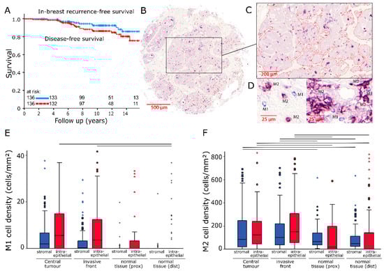 (A) In-breast recurrence-free survival and disease-free survival of the studied patient cohort analysed with the Kaplan–Meier method and log-rank test. (B) Scanned image of a representative breast cancer tissue microarray core (200× magnification). (C) Epithelial tumour compartment marked with an image analysis software. (D) Representative examples of M1 (IHC CD68+; blue) and M2 (IHC CD68+/CD163+; violet) tumour associated macrophages (TAMs). (E,F) Stromal and intraepithelial cell density distributions of M1 and M2 TAMs in samples from four different locations. The central line represents median values while the box is indicative of the interquartile range (IQR). Whiskers represent 1.5× IQR or minimum/maximum. Outliers are indicated by points (up to 3× IQR) or asterisks (>3 IQR). Black bars signify p < 0.05 in Student’s t-test.