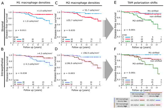 Disease-free survival analysed with the Kaplan–Meier method and log-rank test according to macrophage densities in invasive front samples: (A,B) M1 macrophage densities in the stromal and intraepithelial compartment. (C,D) M2 macrophage densities in the stromal and intraepithelial compartment. (E,F) Disease-free survival according to TAM polarisation shift classifications applied to the stromal and intraepithelial compartment of invasive front samples. The table located in the lower right section explains how results from (A–D) were combined to create the TAM shift classification.