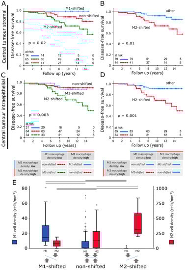 The individual M1 and M2 macrophage densities of each compartment and each tumour location were combined into three new subgroups. The subgroup allocations were based on whether samples belonged to the high or low cell density cohorts in the previously shown Kaplan–Meier plots (Figure 2A–D). Samples with low M2 and high M1 macrophage densities were classified as “M1-shifted”. “M2-shifted” was defined by high M2 and low M1 macrophage densities. If both phenotypes were classified as “high” or “low”, the sample was assigned to the “non-shifted” group.