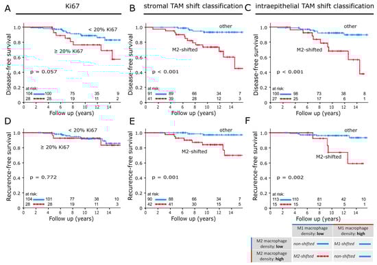 Disease-free survival analysed with the Kaplan–Meier method and log-rank test according to (A) Ki67 and (B,C) the TAM shift classification applied to invasive front samples. In-breast recurrence-free survival analysed with the Kaplan–Meier method and log-rank test according to (D) Ki67 and (E,F) the TAM shift classification applied to invasive front samples. In (B,C,E,F), M2-shifted was compared to the remaining two groups of the TAM shift classification. The table below the survival plots gives a detailed explanation of group compositions.