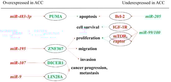 An integrated genome-wide analysis has shown that miR-9, miR-25, miR-124, miR-183, miR-185, and miR-206 were overexpressed in ACC compared to ACA and were associated with down-regulated gene expression of at least 10 genes in ACC [49].
