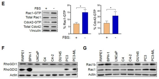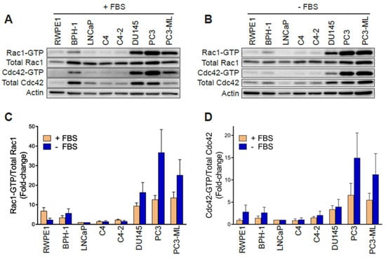 In order to establish whether changes in Rac1 expression or activation occur in aggressive prostate cancer cells, we first determined the total and active (GTP-bound) Rac1 levels. For this analysis, we used non-transformed epithelial cancer cells (RWPE-1, BPH-1), androgen-dependent LNCaP cells, its derivatives C4 and C4-2, as well as aggressive androgen-independent DU145, PC3 and PC3-ML cell lines. Although no major differences in total Rac1 levels could be detected between the prostate cell lines, the assessment of Rac1-GTP levels by a PAK-binding domain (PBD) pull-down assay revealed significantly higher levels of active Rac1 in androgen-independent DU145, PC3, and PC3-ML cells relative to the other cell lines. A quantitative analysis of Rac-GTP levels normalized to total Rac1 showed ~10–15-fold elevation in active Rac1 in DU145, PC3 and PC3-ML cells compared to LNCaP cells (Figure 1A,C). A similar trend was observed for the related small GTPase Cdc42, with the highest Cdc42-GTP levels found in PC3 and PC3-ML cells (Figure 1A,D). These differences were even larger when Rac1-GTP and Cdc42-GTP levels were determined in serum-starved cells, particularly in PC3 and PC3-ML cells (~25–35-fold higher for Rac1-GTP and 10–15-fold higher for Cdc42-GTP, respectively, relative to LNCaP cells) (Figure 1B–D). This was also seen when the androgen-independent PC3 cells were compared to androgen-dependent VCaP prostate cancer cells, both in the presence and absence of FBS (Figure S1A–D). Estimation of the active fraction of these GTPases in PC3 cells revealed that 7% of Rac1 and 18% of Cdc42 were active in the presence of 10% FBS. These values were higher in serum-starved cells (15% for Rac1-GTP and 31% for Cdc42-GTP) (Figure 1E). Taking into consideration that serum and growth factors activate Rac1 and Cdc42 in most cellular models, the elevated Rac1 and Cdc42 activation after FBS removal was unanticipated.