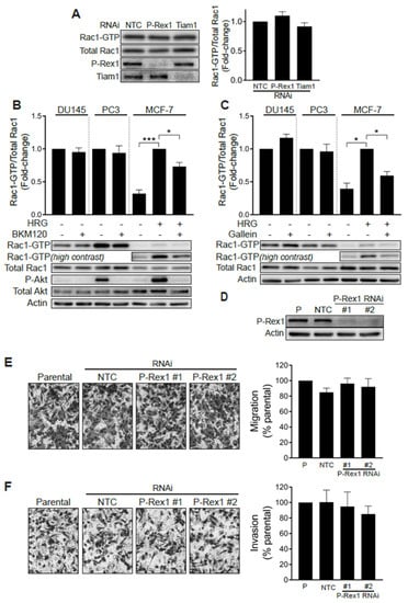 To further validate the P-Rex1 independence of Rac1 activation in prostate cancer cells, we examined the effect of the PI3K inhibitor BKM120 and gallein, an agent that disrupts Gβγ signaling. As shown in Figure 2B,C, neither of these agents were able to reduce Rac1-GTP levels in serum-starved DU145 or PC3 cells. As a control for the inhibitors, we measured the activation of Rac1 by the ErbB3 ligand heregulin-1 (HRG) in MCF-7 breast cancer cells, a response known to be dependent on P-Rex1 activity [26]. In this case, both BMK120 and gallein significantly reduced HRG-induced Rac1 activation. The efficacy of the PI3K inhibitor was also confirmed by its ability to reduce phospho-Akt levels in PC3 and in HRG-stimulated MCF-7 cells. BKM120 and gallein also failed to reduce Cdc42-GTP levels in DU145 and PC3 cells (Figure S1E,F). These results suggest that Rac1 and Cdc42 hyperactivation in androgen-independent prostate cancer cells does not involve aberrant upstream signaling mediated by PI3K/Gβγ -dependent exchange factors, such as P-Rex1.