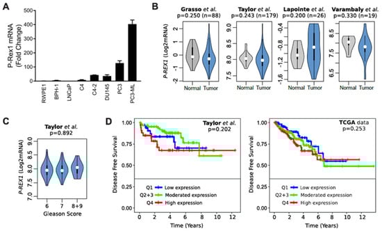 Expression of P-Rex1 in prostate cancer. (A) mRNA expression level of P-Rex1 in the indicated prostate cancer cell lines was assessed by RT-qPCR. (B) Violin plots showing the status of P-Rex1 mRNA expression in prostate cancer tumor and normal tissues. (C) Violin plots showing P-Rex1 mRNA expression relative to Gleason score. (D) Kaplan–Maier curves showing the disease-free survival of patient groups selected according to the PREX1 quartile expression. Analysis was performed using publicly available datasets from (B) Grasso et al. [31], Lapointe et al. [32], and Varambaly et al. [33]. (B,D) Taylor et al. [34] and (D) TCGA.