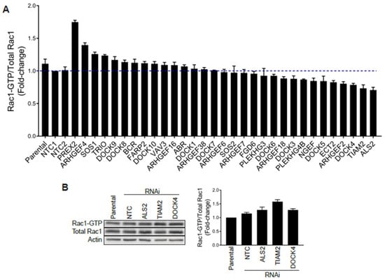 Lentiviral constructs targeting Rac-GEFs and pLKO non-targeting control shRNA constructs were obtained from Sigma-Aldrich. pLKO.1 shRNAs for human ABR (TRCN0000047948), ALS2 (TRCN0000047805), ARHGEF2 (TRCN0000003175), ARHGEF4 (TRCN0000047559), ARHGEF6 (TRCN0000007403), ARHGEF7 (TRCN0000047596), ARHGEF16 (TRCN0000047505), ARHGEF18 (TRCN0000047534), ARHGEF19 (TRCN0000048239), ARHGEF38 (TRCN0000106214), BCR (TRCN0000000789), DOCK1 (TRCN0000029077), DOCK3 (TRCN0000122974), DOCK4 (TRCN0000039730), DOCK5 (TRCN0000113802), DOCK7 (TRCN0000129042), DOCK8 TRCN0000122957), DOCK9 (TRCN0000141047), DOCK10 (TRCN0000122950), ECT2 (TRCN0000047684), FARP2 (TRCN0000047259), FGD5 (TRCN0000048244), FGD6 (TRCN0000047268), KALRN (TRCN0000001430), NGEF (TRCN0000047657), PLEKHG3 (TRCN0000048681), PLEKHG4B (TRCN0000156705), PREX2 (TRCN0000157338), SOS1 (TRCN0000048143), SOS2 (TRCN0000048153), TIAM2 (TRCN0000107211), TRIO (TRCN0000000871), and VAV3 (TRCN0000047699) were obtained from Open Biosystems (Huntsville, AL, USA). Lentiviruses were produced by the Lenti-shRNA Core Facility (UNC-Chapel Hill, NC, USA). Cells were infected with lentivirus particles overnight before selection the following day with puromycin (1 μg/mL).