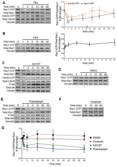 In an effort to identify the mechanisms responsible for this effect, we examined candidate second messengers capable of affecting Rac1 and Cdc42 activation. Considering that multiple extracellular cues lead to elevations in calcium levels, we examined the effect of the calcium ionophore A23187. Notably, treating PC3 cells with this ionophore led to a rapid and sustained reduction in Rac1-GTP and Cdc42-GTP that was not observed with the vehicle DMSO (Figure 6C,D). As a second approach to evaluate the role of intracellular calcium in small GTPase deactivation, we evaluated the effect of thapsigargin, a sarcoplasmic/endoplasmic reticulum Ca2+-ATPase (SERCA) pump inhibitor that promotes a significant elevation in intracellular calcium [44]. Like the calcium ionophore, thapsigargin also reduced Rac1-GTP levels in PC3 cells (Figure 6E). In contrast, stimulation of cAMP production with forskolin did not cause a significant effect (Figure 6F). A quantitative analysis of these effects is depicted in Figure 6G. Therefore, this sensitivity to thapsigargin and the ionophore A23187 demonstrates a role for calcium-signaling events in mediating the rapid inactivation of Rac1-GTP and Cdc42-GTP in PC3 cells.