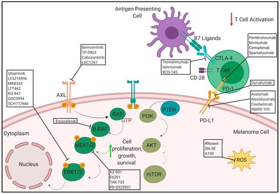 Novel therapies in pre-clinical and clinical phases (Anti PD-1/anti-PD-L1, anti CTLA-4, AXL inhibitors. BRAF inhibitors. ERK inhibitors and ROS activated prodrugs) to treat patients with metastatic melanoma (created with BioRender; www.biorender.com).