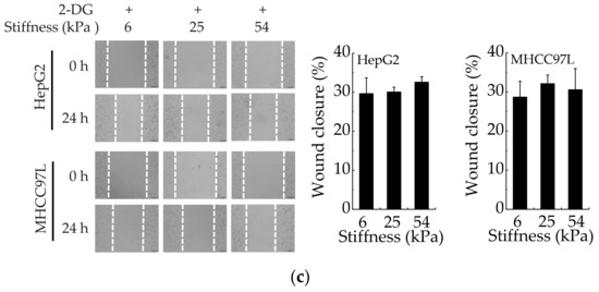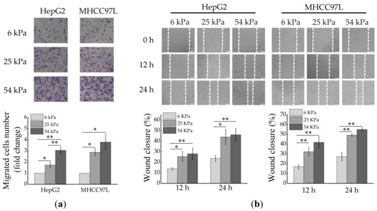 To investigate the effect of ECM stiffness on the migration of HCC cells, we prepared polyacrylamide (PA) hydrogels with three kinds of stiffness (6, 25 and 54 kPa, matching the physiological elasticities of normal liver, cirrhosis and HCC tissues [33,34,35]). After cultured for 48 h, the migration ability of HCC cells was measured by using wound scratch assay and transwell assay. The results showed that the migration ability of HepG2 and MHCC97L cells all significantly increased with the increase of hydrogel stiffness (Figure 1a,b).