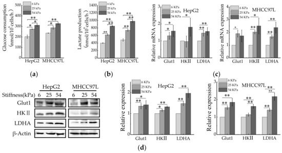 Aerobic glycolysis is a metabolic hallmark of most cancer cells, including HCC cells, characterized by excessive consumption of glucose and huge production of lactate, whether or not oxygen is present [36]. We were curious about whether ECM stiffness would also regulate aerobic glycolysis of HCC cells. After being cultured for 48 h, the levels of glucose consumption and lactate production of HCC cells were measured. Compared with 6 kPa, HCC cells cultured on stiffer matrix resulted in increasing glucose consumption and lactate production (Figure 2a,b). As cancer cells accelerated glycolysis generally by preferential expression of glucose transporters (e.g., Glut1) [18] and key glycolytic enzymes (e.g., HK II and LDHA) [37,38]. We therefore explored whether ECM stiffness regulates expression of these glycolysis-associated enzymes. As expected, significant up-regulation of Glut1, HK II and LADH were observed in HCC cell lines cultured on the stiffer matrix (Figure 2c,d). Collectively, these results suggested that ECM stiffness might be a regulator of aerobic glycolysis in human cancers.