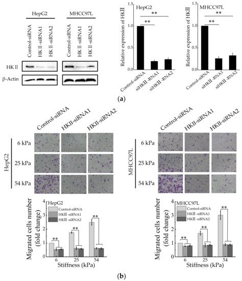Aerobic glycolysis is responsible for stiffer ECM-mediated migration. (a) Western blot analysis showed the protein expression of HKII in HepG2 and MHCC97L after knockdown of HKII (n = 3, ** p < 0.01 versus control-siRNA group). (b) Transwell analysis of HKII-knockdown HepG2 and MHCC97L cells migration (Scale bar: 100 µm; n = 3, ** p < 0.01). (c) Wound scratch assay analysis of HepG2 and MHCC97L cells after treatment with 2-DG (20 mM) (Scale bar: 100 µm; n = 3).
