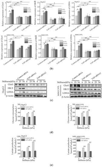 YAP is responsible for ECM stiffness-mediated aerobic glycolysis. (a) Western blot analysis of YAP expression in HepG2 and MHCC97L cells after YAP knockdown (n = 3, ** p < 0.01 versus control-siRNA group). (b) qRT-PCR analysis of indicated genes mRNA levels in YAP-knockdown HepG2 and MHCC97L cells. (c) Western blot analysis of indicated proteins in YAP-knockdown HepG2 and MHCC97L cells. (d,e) Measurement of glucose consumption (d) and lactate production (e) in HepG2 and MHCC97L cells after YAP knockdown (n = 3, * p < 0.05, ** p < 0.01).