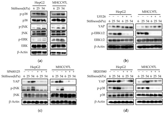Hippo/YAP and MAPK signaling pathways have been recognized as important regulators of the initiation and progression of cancer [43,44,45]. Many studies have shown that YAP and MAPK act as mediators in regulating biological behaviors of cancer cells. In this study, we investigated the role of these pathways in stiffer ECM-induced HCC cells migration. The results showed that stiffer ECM increased the activity of YAP, JNK and p38. Interestingly, a JNK inhibitor or a p38 inhibitor decreased YAP expression and transcriptional activity. These results indicated that ECM stiffness acted as the upstream of the MAPK signaling axis, activated the phosphorylation of MAPK, then triggered YAP activation and the downstream cascade reaction. Therefore, we suggested that MAPK-YAP signaling cascade represent a possible and future mechanotransduction pathway to study, probably essential for promoting HCC cell migration processes.