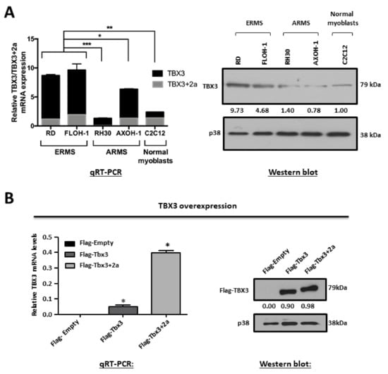 TBX3 is overexpressed in embryonal rhabdomyosarcoma (ERMS). (A) Total RNA and protein were extracted from RMS cell lines (ERMS: RD, FLOH-1 and ARMS: RH30 and AXOH-1) and normal muscle myoblasts (C2C12). (Left) qRT-PCR was performed on reverse transcribed RNA using primers specific to TBX3, TBX3+2a and GUSB/GusB (housekeeping gene) and mRNA levels were normalised to GUSB/GusB and quantified relative to C2C12. (Right) protein extracts were subjected to Western blot analysis with antibodies specific to TBX3 and p38 (loading control). (B,C) Establishment of ERMS cell culture models in which TBX3 was either stably overexpressed or knocked down in the RD cell line. mRNA and protein from (B) RD Flag-Empty, Flag-Tbx3 or Flag-Tbx3+2a cell lines and (C) RD shCTRL and shTBX3 clones were subjected to (left) qRT-PCR with primers specific to TBX3 and GUSB and mRNA levels were normalised to GUSB and (right) Western blotting with antibodies to (B) Flag-tag (representative of ectopically expressed Flag-TBX3 protein) and (C) TBX3 and p38 was used as a loading control. Densitometric readings for all Western blots were calculated relative to the p38 control. The values in the graphs represent the mean of at least three independent experiments ± SEM (* p < 0.02; ** p < 0.002; *** p < 0.0001).