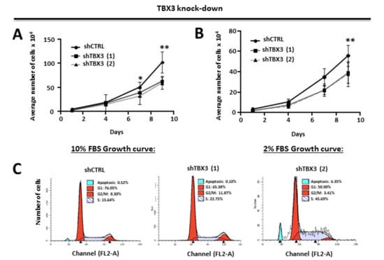The next set of experiments therefore determined the cell cycle profile of shCTRL and shTBX3 cells cultured in standard 10% FBS using fluorescence assisted cell sorting (FACS). The results show that the shCTRL and shTBX3 (1) cells exhibited a profile typical of dividing cells (Figure 4C). Interestingly, the shTBX3 (2) cell line displayed an increased percentage of apoptotic cells, which provides support for previous studies showing that TBX3 promotes cancer cell survival through its ability to evade apoptosis [24]. In addition, the shTBX3 (2) cell line also had an increase percentage of cells in S-phase, which is consistent with a previous report that TBX3 may be required for cells to transit through S-phase and that this function may be linked to its role as a pro-proliferative factor [50]. It is worth noting that, compared to the shTBX3 (1) cell line, the levels of TBX3 were always lower in the shTBX3 (2) cell line (see Figure 1C) and that these cells proliferated slower, albeit not statistically significant. This suggests that the impact of TBX3 on apoptosis and the cell cycle may be dependent on intracellular levels of TBX3.