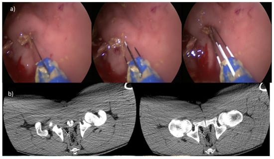 (a) Application on rectum with the trans-anal endoscopic procedure and the 5-needle expandable electrode (20° of divergence; (b) CT transversal sections in the two deployments: on the left, peripheral needles with exposure of 3 cm; on the right side, peripheral needles exposure of 4 cm; (c) volume rendering: in the top, deployment of central needle of 4 cm and peripheral needle exposure of 3 cm; down, central needle and peripheral needles exposure of 4 cm.