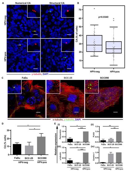 However, when cultured cells from HPV-pos and HPV-neg OPSCCs were stained for CA, we observed that HPV-pos OPSCC cells (SCC090) exhibit higher CA (p < 0.05) relative to the HPV-neg OPSCC cells (FaDu and SCC-25) (Figure 1C,D). Our findings from RT-PCR also indicate significantly higher levels of centrosomal (pericentrin, γ-tubulin and centrin-1) and CA-associated (PLK4) mRNA expression in HPV-pos OPSCC cells compared to levels observed in HPV-neg OPSCC cells (Figure 1E). Taken together, these findings clearly demonstrate a high prevalence of CA in HPV-neg OPSCC tissue sections from patient samples, but not in cultured cell lines, and suggest that differences between the in vivo tumor microenvironment and in vitro culture conditions are at least partly responsible for this discrepant observation.