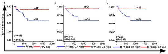 CA is associated with poor overall survival in HPV-neg OPSCCs. (A) Kaplan Meier survival curves representing the survival probabilities of HPV-neg (n = 51) and HPV-pos (n = 47) OPSCC patients (HR = 4.629; p = 0.0062), (B) Kaplan Meier survival curves representing the survival probabilities of high-CA HPV-neg (n = 34) and HPV-pos (n = 26) OPSCC patients (HR = 5.07; p = 0.003), and (C) Kaplan Meier survival curves representing the survival probabilities of high-CA HPV-neg (n = 34) and low CA HPV-neg (n = 17) OPSCC patients (HR = 5.379, p = 0.08).
