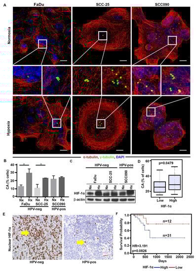 HPV-neg OPSCCs show a strong association between CA and HIF-1α expression. (A) Confocal immunomicrographs showing numerical CA in HPV-pos and HPV-neg tumor cells cultured in normoxic and hypoxic conditions. OPSCC cells were immunostained for centrosomes (γ-tubulin, green), microtubules (α- tubulin, red) and counterstained with Hoechst (blue). Scale bar (white), 20 μm. (B) Percentage distribution of cells with CA (structural and numerical) in HPV-neg and HPV-pos cells in normoxic (Nx) and hypoxic (Hx) conditions. (C) Immunoblots of HIF-1α in FaDu, SCC-25, and SCC090 OPSCC cells cultured in normoxic (Nx) and hypoxic (Hx) conditions. (D) Box plot depicting the distribution of CA in HIF-1α-high (n = 30) and -low (n = 12) HPV-neg tumors (p = 0.0479). (E) Representative immunohistochemical micrographs of HPV-pos and HPV-neg OPSCC tumors stained for HIF-1α. (F) Kaplan Meier survival analysis representing overall survival in HPV-neg OPSCCs stratified based on HIF-1α scores (HR = 3.191; p = 0.0826). * p < 0.05.