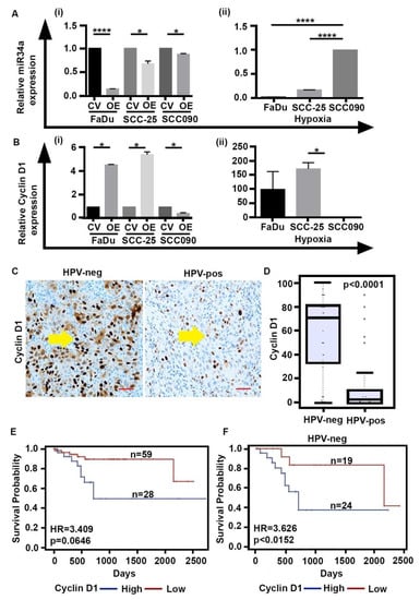 Hypoxia induces CA by upregulating the expression of cyclin D1 via downregulating miR-34a in HPV-neg OPSCCs. qRT-PCR analysis of (Ai) miR-34a in FaDu, SCC25, and SCC090 OPSCC cells cultured in normoxic and hypoxic conditions (normalized to normoxic conditions for each individual cell line), (Aii) miR-34a in FaDu, SCC25, and SCC090 OPSCC cells grown under hypoxic conditions compared to the expression of miR-34a in FaDu, SCC25, and SCC090 OPSCC cells grown under normoxic conditions, (Bi) Cyclin D1 in FaDu, SCC25, and SCC090 OPSCC cells cultured in normoxic and hypoxic conditions (normalized to normoxic conditions for each individual cell line), (Bii) Cyclin D1 in FaDu, SCC25, and SCC090 OPSCC cells cultured in hypoxic conditions. Data were normalized by the amount of Ctrl_miRTC_1 and beta-actin mRNA, for miR34a and CCND1, respectively, expressed relative to the corresponding value for all the cells and are means ± SD from triplicate data. (C) Immunohistochemical micrographs of HPV-pos and HPV-neg OPSCC tumors labeled with nuclear cyclin D1. Scale bar (red), 50 μm (D) Box plot representing the distribution of cyclin D1 WI in HPV-pos (n = 44) and HPV-neg (n = 43) tumors (p < 0.0001). (E) Kaplan Meier survival curves representing the overall survival of cyclin D1 high (n = 28) and low (n = 59) groups in HPV-neg and HPV-pos OPSCC patients (HR = 3.409; p = 0.0646). (F) Kaplan Meier survival curve representing the overall survival of cyclin D1-high (n = 24) and -low (n = 19) groups in HPV-neg OPSCC patients (HR = 3.626; p = 0.0152). * p ≤ 0.05, **** p ≤ 0.0001.