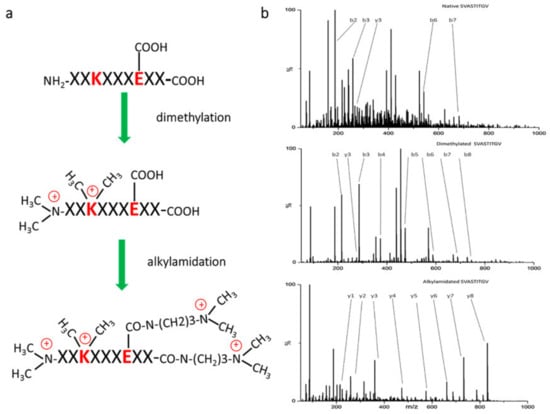 - Cárdenas, M.S.; van der Heeft, E.; de Jong, A.P.J.M. On-line derivatization of peptides for improved sequence analysis by micro-column liquid chromatography coupled with electrospray ionization-tandem mass spectrometry. Rapid Commun. Mass Spectrom. 1997, 11, 1271–1278. [Google Scholar] [CrossRef]