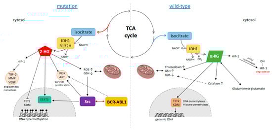 Isocitrate dehydrogenase 1 (IDH1) is one of the most important enzymes to be involved in cellular metabolism and can be strongly associated with the risk of cancer as well as its clinical outcome. This enzyme catalyses the oxidative decarboxylation of isocitrate into α- ketoglutarate (α-KG) during the tricarboxylic acid cycle (TCA), and utilizes nicotinamide adenine dinucleotide phosphate (NADP+) as a cofactor during the reaction, while generating its reduced form: NADPH [1]. IDH1 is localized primarily in the cytosol and peroxisomes, where it plays an important role in maintaining NADPH levels, which are critical for the redox balance that is established by the glutathione and thioredoxin systems [2,3]. An increased level of IDH1 is also linked to catalase activation, which prevents oxidative stress and apoptosis [4,5,6]. However, it is noteworthy that IDH1 also plays an important role in cellular metabolism, proliferation and production energy by participating in the glutamine metabolism and the glucose secretion pathway as well as in the biosynthesis of fatty acids and lipids [7,8]. Cancer cells are characterized by an accelerated metabolism and an increased demand for glucose and other nutrients. Therefore, the overexpression of the wild-type IDH1 is often associated with the uncontrolled growth and survival of numerous cancers, including non-small cell lung carcinoma [9], primary glioblastomas (GBMs) [10], pancreatic ductal adenocarcinoma [11] and several hematological malignancies such as lymphomas or leukemias [12,13]. On the other hand, mutations of the genes encoding the IDH1 enzyme have also been found in several cancers, mainly in about 80% of low-grade gliomas and secondary GBMs, about 40% of T cell lymphomas and in about of 10% of myeloid leukemias [13,14]. The vast majority of IDH1 mutations are heterozygous point mutations that lead to the substitution of arginine in codon 132 within the catalytic pocket of an enzyme. Most of them (over 90%) are related to a missense mutation in a gene, which is based on a single base exchange of guanine to adenine (G395A) that results in the amino acid replacement of arginine by histidine (R132H). Importantly, this change of amino acid is critical for isocitrate binding [15,16]. An IDH1 mutation causes the loss of the normal enzymatic activity of protein, and at the same time allows for the gain of a new function. Therefore, IDH1 R132H is also capable of catalyzing the reduction of α- ketoglutarate to D-2-hydroxyglutarate (2-HG), while converting NADPH to NADP+ [17]. An accumulation of the onco-metabolite 2-HG inhibits several 2OG-dependent oxygenases such as the hypoxia-inducible factor (HIF) hydroxylases, histone demethylases (i.e., KDM), 5-methylcytosine hydroxylases (i.e., TET family), and the JmjC domain-containing enzymes, which contributes to epigenetic aberrations and an intensified activity of HIF activity (Figure 1). In turn, the activation of the hypoxic pathways may induce a number of genes (i.e., TGF-β, PDGF, MMPs, VEGF) that affect tumor cell growth and differentiation as well as an invasion, angiogenesis, and metastasis. These activities are usually associated with the promotion of gliomagenesis or leukemogenesis and the malignant progression of brain tumors [17,18,19].