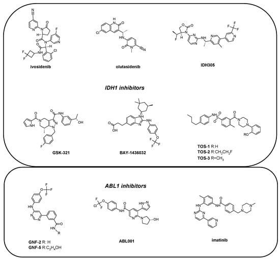 The inhibitors of isocitrate dehydrogenase – IDH1 (upper box) and ABL1 tyrosine kinase (lower box) that are relevant to this study.