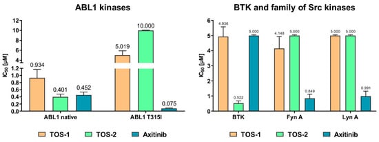 Both TOS expressed level of activity similar to axitinib and imatinib against ABL1. The T315I mutant was more resistant to all compounds with exception of axitinib. Interestingly TOS-1 and TOS-2 have more complex profile with activities towards other kinases that were tested. In Figure 3, activities that causes a 50% reduction of enzyme activity (IC50) are presented for the most active compounds.