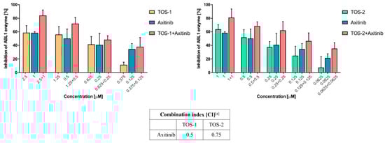 The inhibition of the ABL enzyme by the combination of TOS inhibitors and axitinib were measured using an ABL1 Kinase Assay (Promega) according to a methodology that was similar to the one described above. The experiments were performed at least three times. The synergy was calculated according to the Chou-Talay method (CompuSyn software) [33,70]. Briefly, the concentration range was adjusted to cover the specified IC50 value against the ABL1 enzyme for each inhibitor. Five concentrations of the TOS inhibitors and axitinib were tested. The doses were increased at a constant ratio according to refs [33,70] (Table S1).