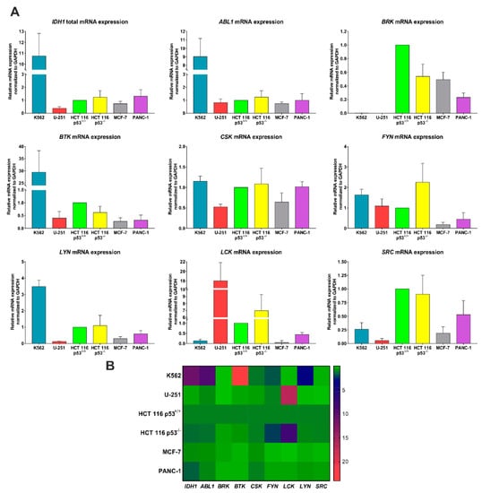 mRNA expression of the IDH1, ABL1, BTK, BRK and Src family tyrosine kinases in the various cancer cell lines (K562, U-251, HCT 116 p53+/+, HCT 116 p53-/-, MCF-7 and PANC-1). The results are shown as the mean ± SD of four independent measurements, each in triplicate. The data were normalized to the HCT 116 p53+/+ (one value) (A). Heat map displaying the expression of IDH1 and the kinase landscapes in the tested cancer cell lines (B).