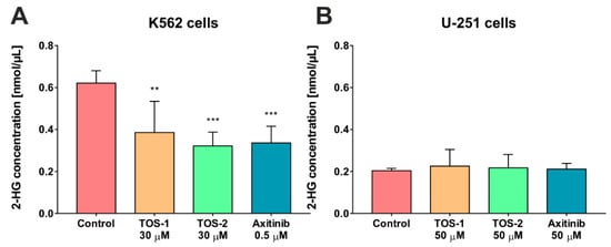 Influence of the tested inhibitors – TOS-1, TOS-2 and axitinib on 2-HG production in the K562 (A) and U-251 cells (B). Data were analyzed using a one-way ANOVA with Bonferroni’s post-hoc test: ** p < 0.01, *** p < 0.001 compared to the control (untreated cells).