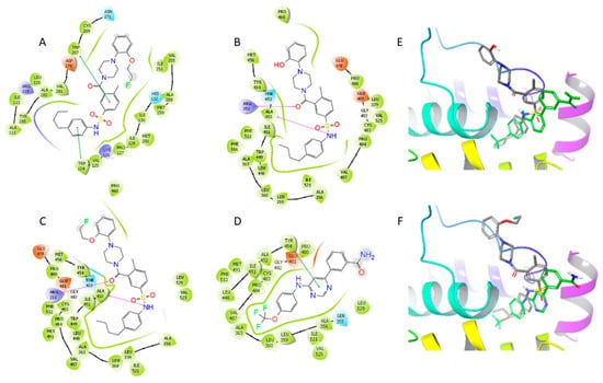 According to our expectations, both tosylamides appeared active against ABL1 on the same level as both standard drugs. TOS were less active against T315I and imatinib has lost its potency against this enzyme, while axitinib was even more active than against wild type protein. As was reported by Pemovska et al., the specific binding conformation, which is possible in axitinib and the A-loop position of a mutated enzyme [30]. For axitinib, the IC50 values that were calculated were 0.452 μM for the ABL1 native and 0.075 μM for the mutated T315I. Interestingly, TOS-1 and TOS-2 expresses substantially different activity patterns despite their structural similarity. The fluoroethyl derivative appeared more active and selective towards the ABL1 and BTK kinases. The calculated IC50 value was 0.401 μM against the ABL1 wild type, while for the mutated form, it was not possible to calculate it within the range of the tested concentrations (>10 μM). For BTK kinase, the obtained IC50 value was similar (0.522 μM). By contrast, TOS-1 was the most active against ABL1 (IC50 = 0.934 μM). Additionally, it had a moderate activity against BTK, CSK and Lck at a similar level. This derivative also had some effect on BRK and Fyn A. These differences can only be partially explained by the changed interaction profile in those two derivatives.