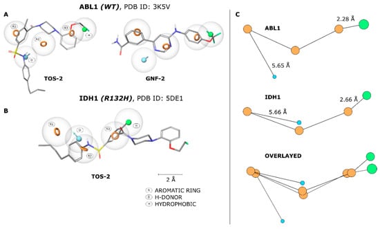 (A). TOS-2 and GNF-2 matched into the pharmacophore based on the ABL1 WT myristate binding site. (B). TOS-2 matched into the pharmacophore based on the IDH1 R132H allosteric site. The Figure 2. Å. (C). Graphic representations of the pharmacophores: the aromatic ring features are aligned to the page plane. The circle size is relative to the plane distance.