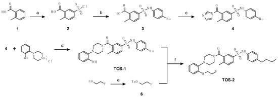 Commercially available 1 was reacted with chlorosulfonic acid (Scheme 1) to obtain 2, which was then microwaved with p-butylaniline hydrochloride in the presence of pyridine and DMAP. The sulfamoyl derivative 3 was then reacted with 1,1′-carbonyldiimidazole and product 4 without isolation was further irradiated with 2-hydroxyphenlypiperazine hydrochloride in order to obtain TOS-1. Its fluoroethyl derivative TOS-2 was obtained from TOS-1 using microwave irradiation and freshly prepared 6.