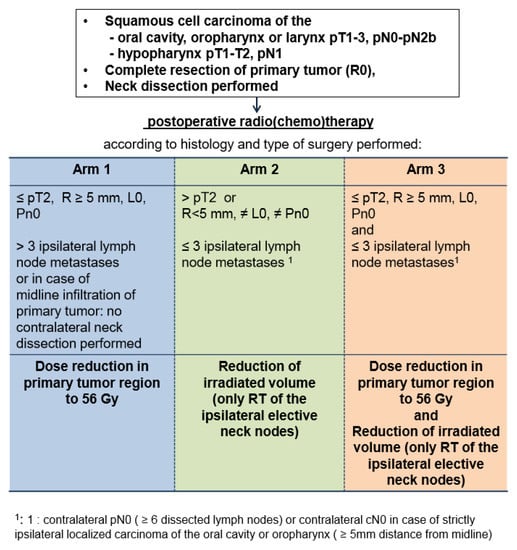 Low-risk was specified as either low-risk for local recurrence in the primary tumor region or for occurrence of any contralateral neck lymph nodes. In case of low-risk for local recurrence of the primary tumor defined as pT ≤ 2, no peritumoral lymphatic vessel invasion (L0), no peritumoral perineural spread (Pn0) and a resection safety margin of ≥5 mm, irradiation dose to the primary tumor region was reduced to a total dose of 56 Gy. In patients with a genuine low risk for contralateral neck recurrence (≤p T3, ≤3 ipsilateral neck node metastases, contralateral no lymph node metastases defined as either pN0 or contralateral cN0 in case of well lateralized oral cavity or oropharyngeal carcinoma) prescribed target volume was reduced by electively irradiating only the ipsilateral neck nodes. This resulted in three protocol treatment arms (see Figure 1).