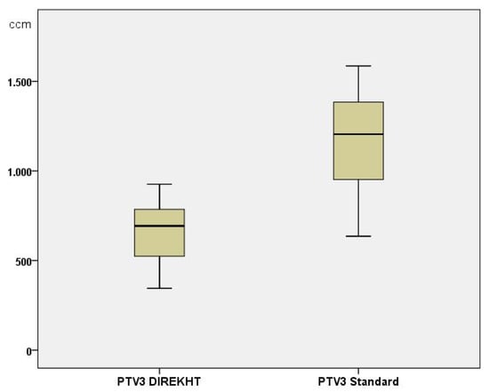 Mean PTV 2 was 391 mL (standard deviation: +/− 120 mL; range 170; 598 mL) in the study and standard treatment plans.