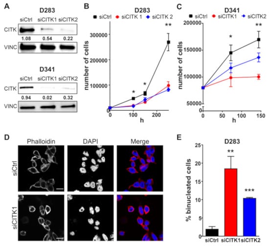 Then, 8 × 104 D341 cells were seeded into 6-well plates, transfected with siCtrl, siCITK1 and siCITK2 and counted, after 72 and 144 h, in triplicates, with Biorad TC20 Automated Cell Counter (Bio-Rad, Hercules, CA, USA).